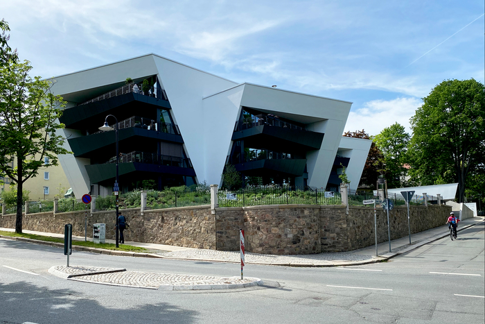Die Tanzende Siedlung beschreibt ein Ensemble aus vier Wohngebäuden, das von einem parkähnlichen Außenraum gerahmt wird. Das Quartier auf dem Kaßberg überrascht mit ungewöhnlichen Winkeln und besonderer Freiraumgestaltung.