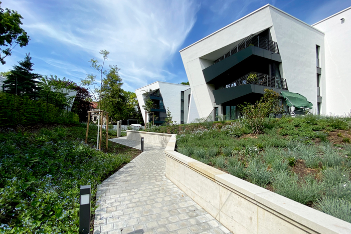 Die dynamische Formensprache der Architektur setzt sich im Freiraum in der Gestaltung von Wegen, Plätzen und Pflanzflächen fort. Durch den Erhalt und die Integration von altem Buchenbestand und dem Anpflanzen einer Vielzahl neuer Baum- und Strauchpflanzungen wurden visuelle und räumliche Akzente gesetzt. Vielfältige Stauden- und Ziergrasflächen dienen der Ausbildung von eher geschützten / privaten Terrassenräumen. Ein zentraler Platz mit einer einzigartigen Brunnenanlage wirkt als gemeinsamer Treffpunkt der Bewohner.